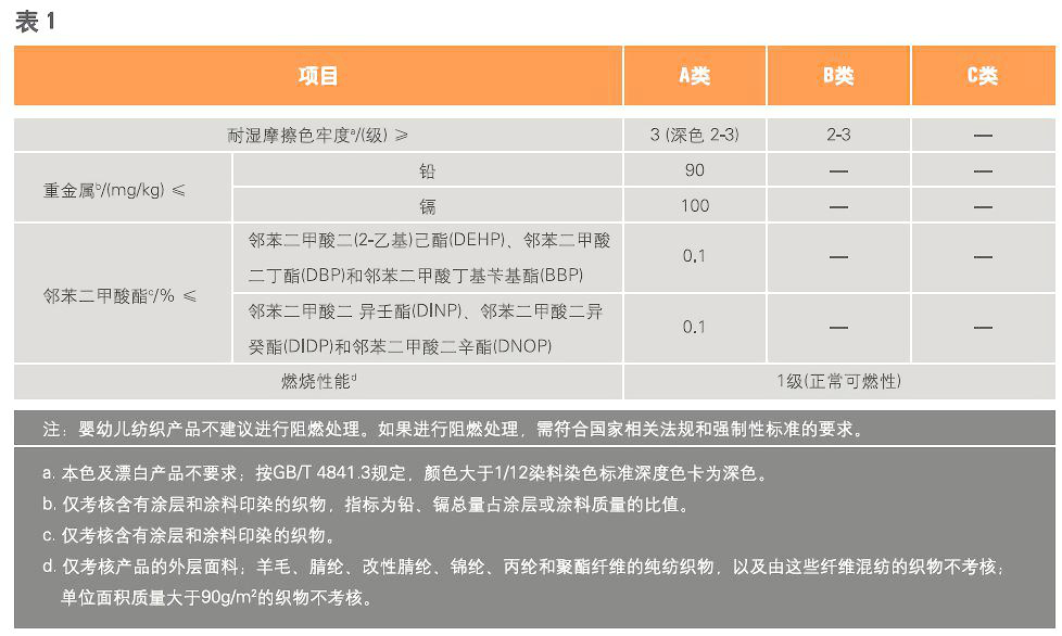 婴幼儿及儿童纺织产品的面料、里料和附件所用织物应符合GB 18401中对应安全技术类别的要求以及表1的要求。