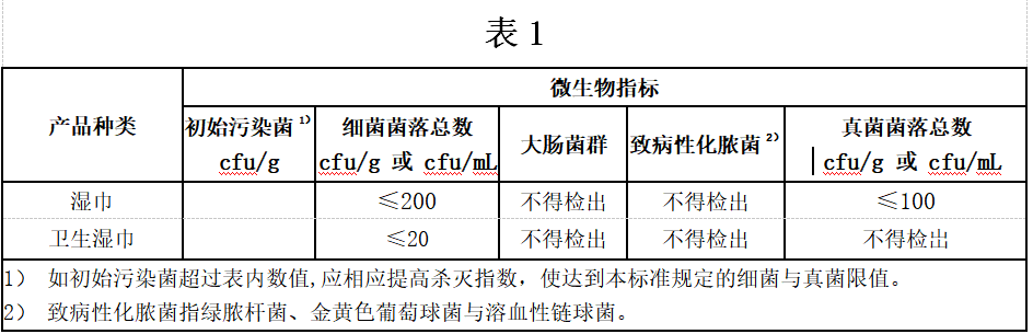 备注:表格摘自 WS 575-2017 <卫生湿巾卫生要求>表1.
