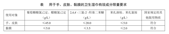 皮肤、黏膜用卫生湿巾的杀菌有效成分(含有清洗作用的杀菌有效成分)应使用非工业级原料。常用的医用消毒巾使用的苯扎氯胺等季铵盐,具有良好的消毒效果,美国FDA和欧盟也许可其使用,所以商家也常以此作为宣传点。但是其会在皮肤和粘膜上造成腐蚀性影响,在眼睛上面有强烈的腐蚀性影响,因此需要对其进行限量,用户购买时需要特别注意含量。