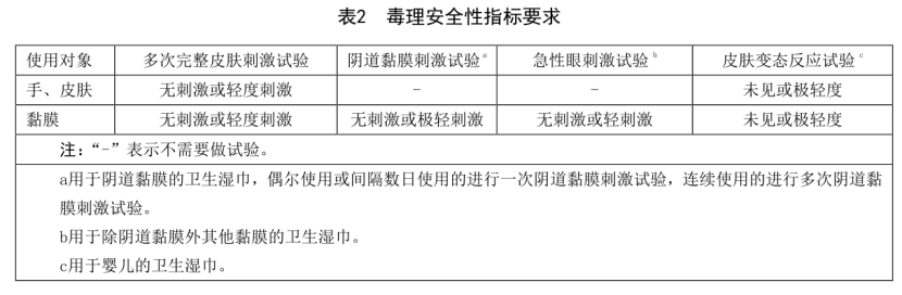 不刺激也是卫生湿巾常见的宣传点,皮肤容易过敏者最有体会。用于手、皮肤、粘膜的卫生湿巾首次上市时,应进行相应的毒理学试验,其结果应符合表2的要求。