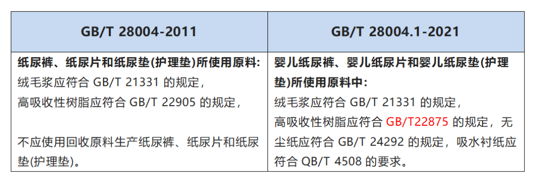 新标准新增了无尘纸和吸水衬纸的要求,高吸收性树脂调整为“应符合GB/T 22875规定”。