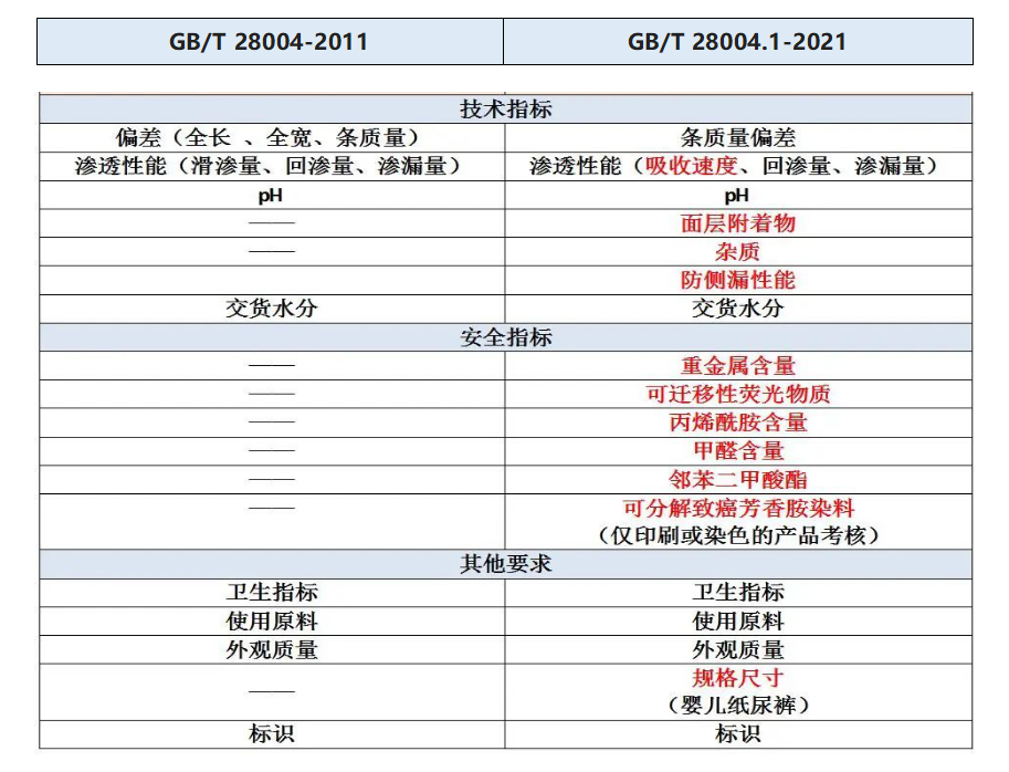 新标准修改了标准范围。取消了 “滑渗量”这一考核指标,并以“吸收速度”替代。删除了 “全长偏差”和“全宽偏差”, 新增了“适用体重和适用腰围最大值的要求”、“吸收速度”、“面层附着物”、“杂质”、“防侧漏性能”、“重金属”、“可迁移性荧光物质”、“甲醛”、“丙烯酰胺”、“邻苯二甲酸酯”和“可分解致癌芳香胺染料”11个指标要求。
