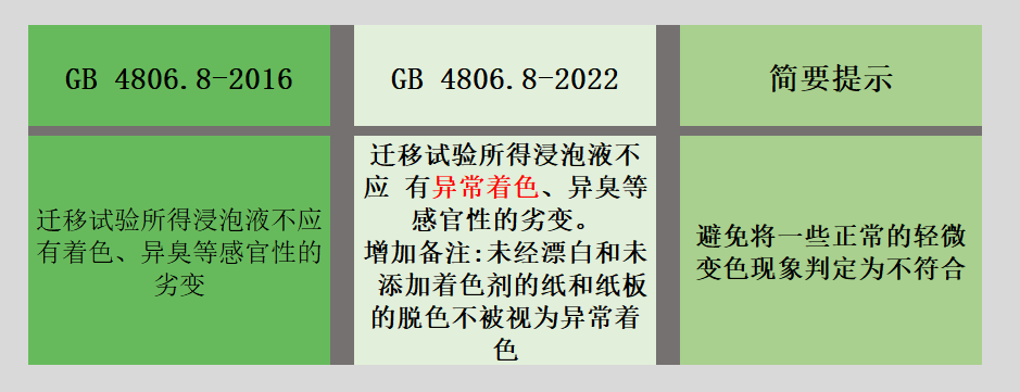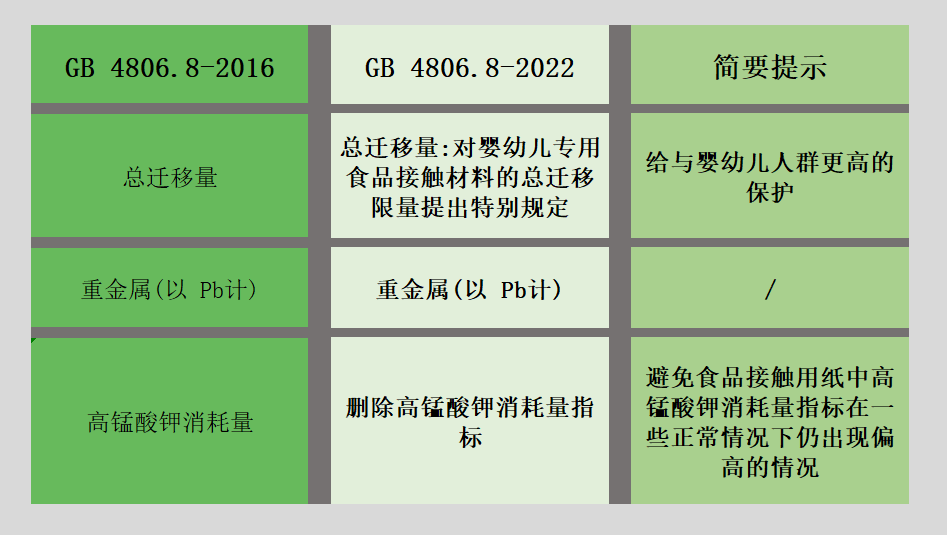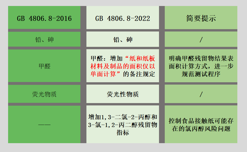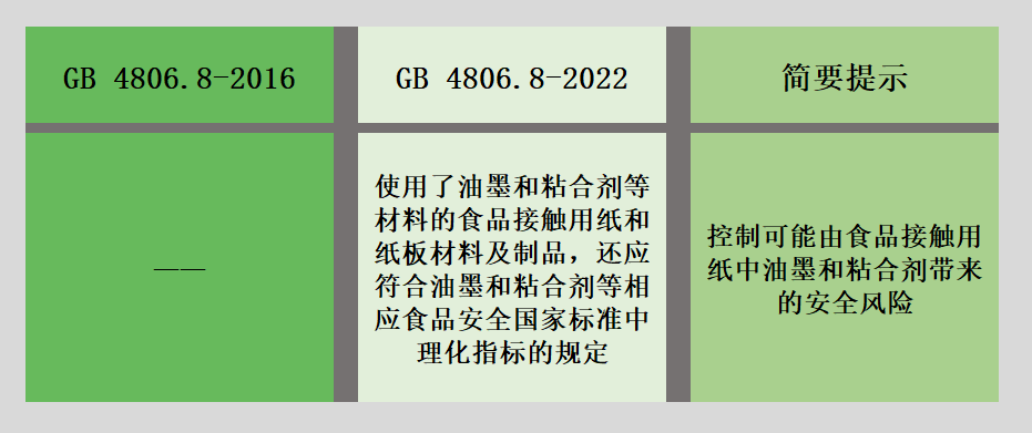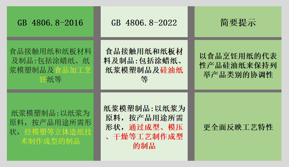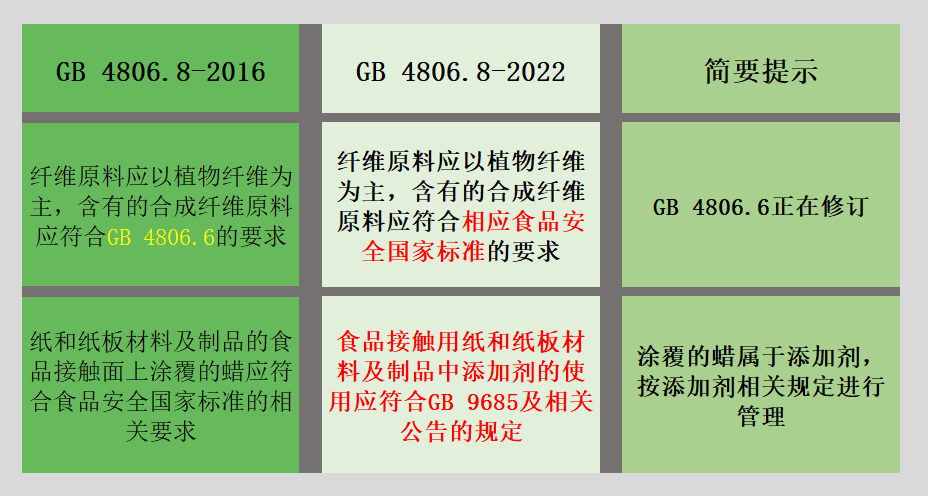 新的食品接触用纸品标准代替GB 4806.8—2016《食品安全国家标准 食品接触用纸和纸板材料及制品》。本标准与GB 4806.8—2016相比,主要变化如下: