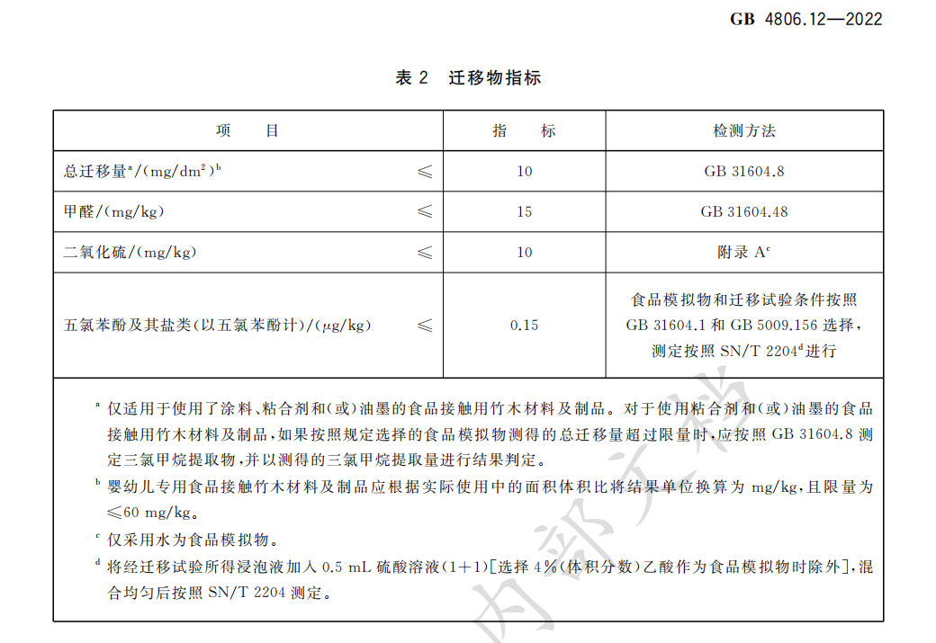 2022年7月28日,国家卫生健康委员会发布了36项食品安全国家标准(卫健委2022年第3号公告),其中包括食品接触用竹木产品标准。