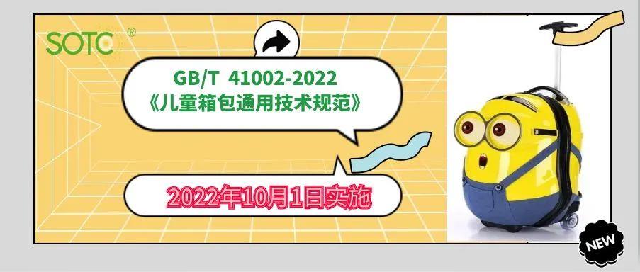 《儿童箱包通用技术规范》标准GB/T 41002-2022于2022年03月09日发布,于2022年10月01日实施。标准为首次发布,解决了我国长期无儿童箱包国家标准的问题。